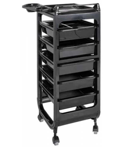 Тележка парикмахерская черного цвета на колесах, пять выдвижных ящиков, дополнительная навесная панель с чашей и отверстиями для парикмахерских инструментов. Материал - пластик.